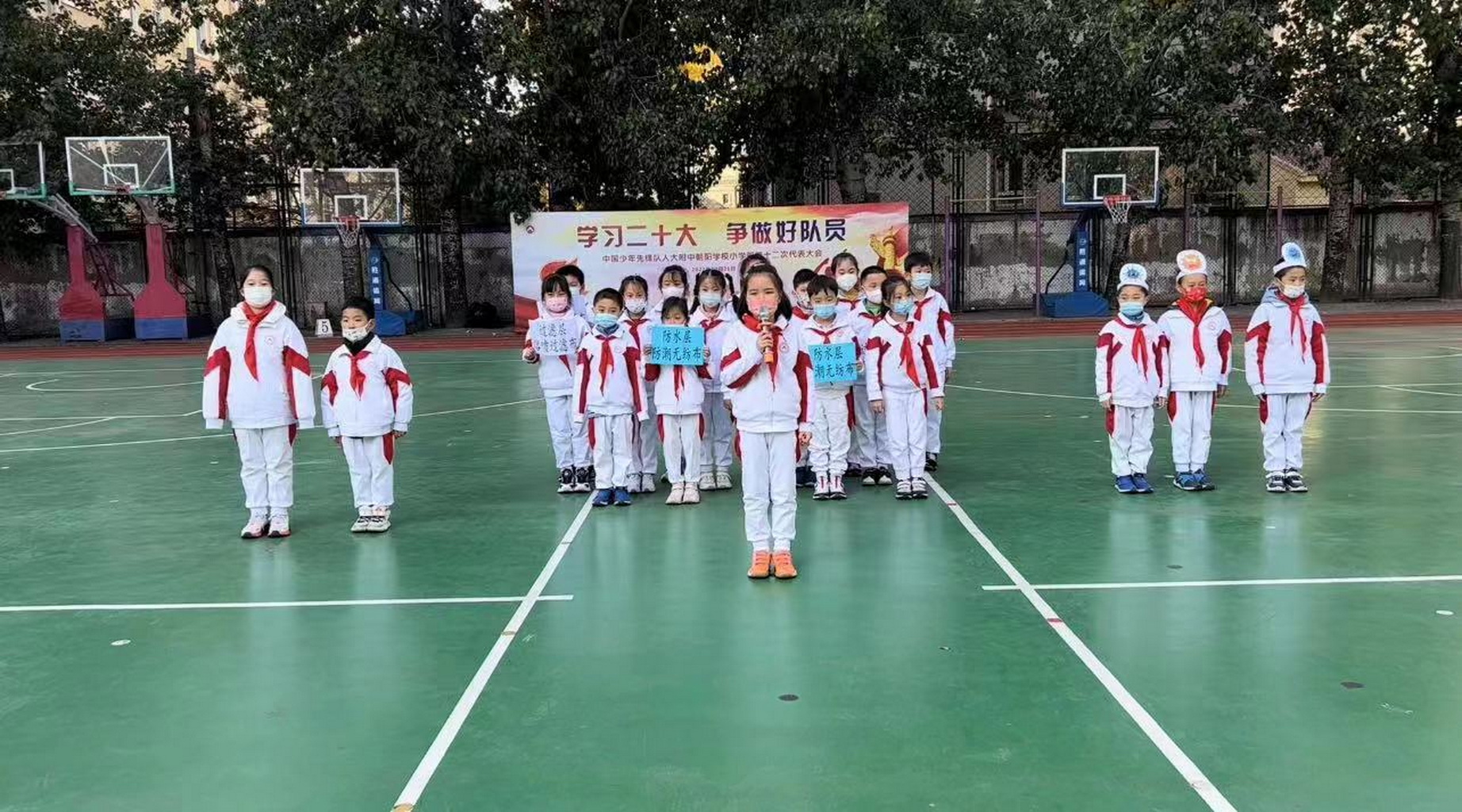 升旗仪式上,开展“小口罩大作用”的小剧场表演
