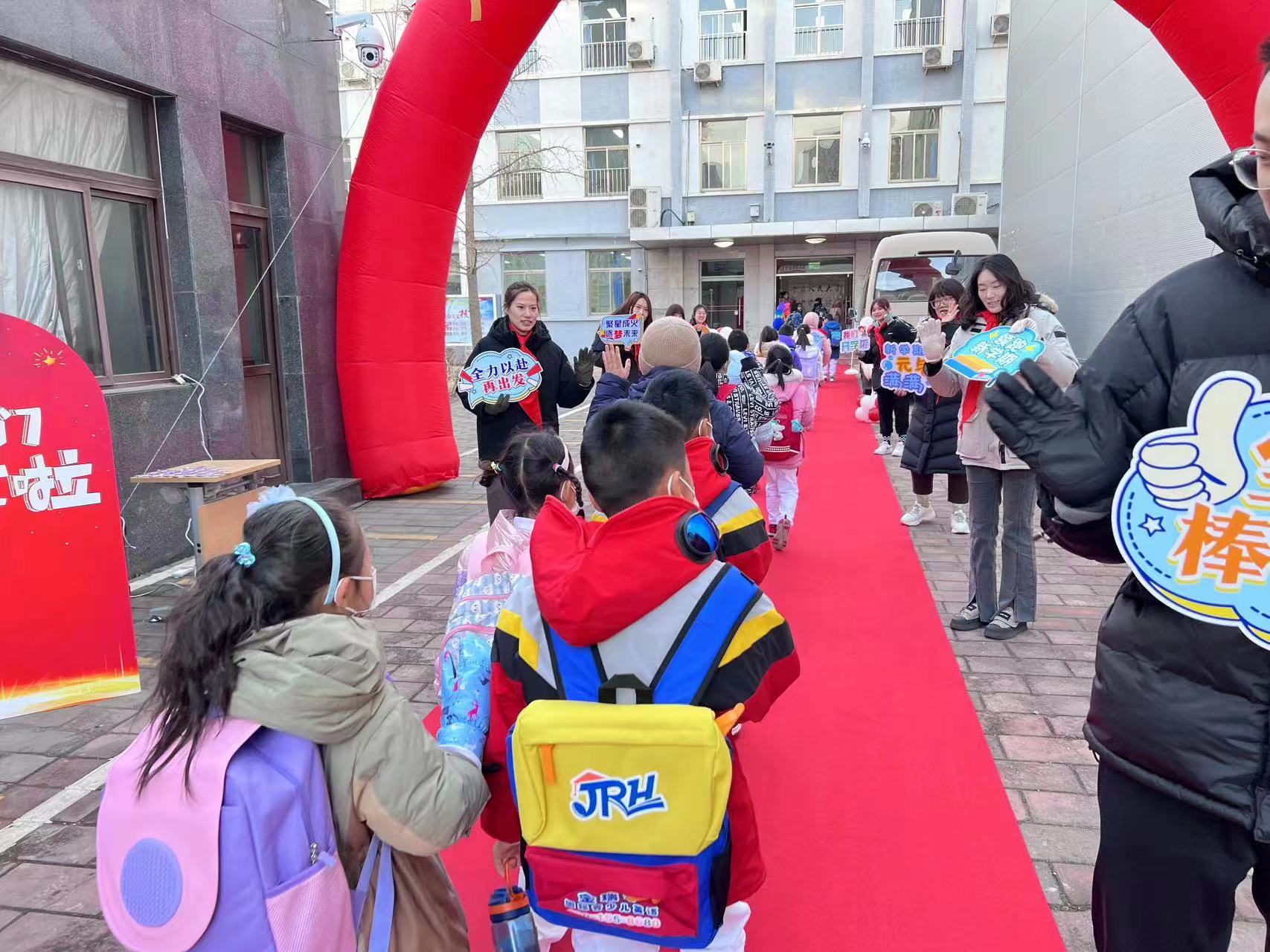 开学啦!老师们在门口欢迎学生返校!